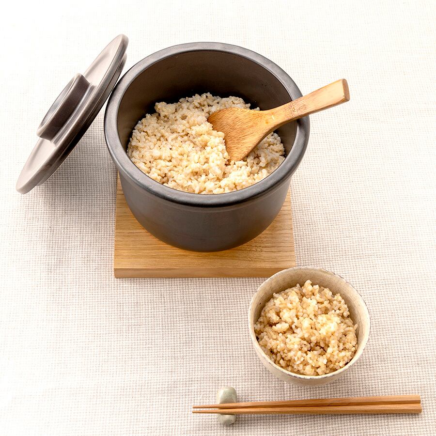 1.洗って水を切った玄米を1合と水1合、塩小さじ10分の1を、カムカム鍋に入れて蓋をする。※カムカム鍋の中の水は、米と等量